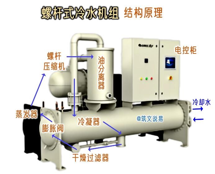 螺桿式冷水機組的主要部件為壓縮機、冷凝器、膨脹閥與蒸發器,輔助部件常見的有外置式油分離器、經濟器、干燥過濾器、電磁閥以及視液鏡等。